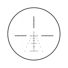 - Das Absehen ermöglicht die Korrektur des Haltepunkts und verfügt über kaskadierende Abdriftpunkte zur Kompensation von Winddrift beim Einsatz von nahezu allen Jagdpatronen für Großwild
